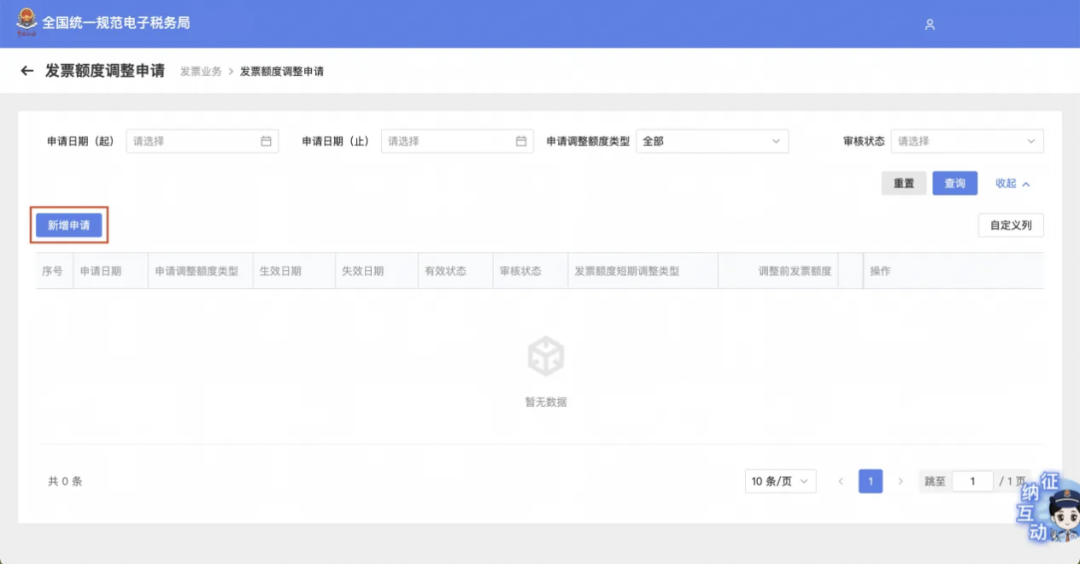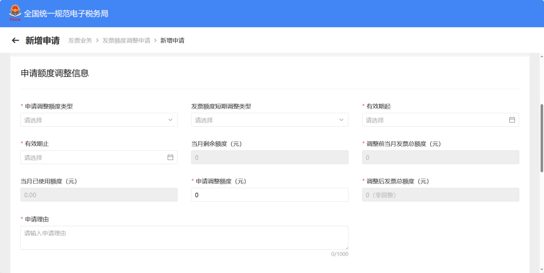 如果当月的发票额度已经用完,可以在【发票额度调整申请】模块向主管税务机关申请提额。