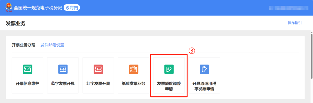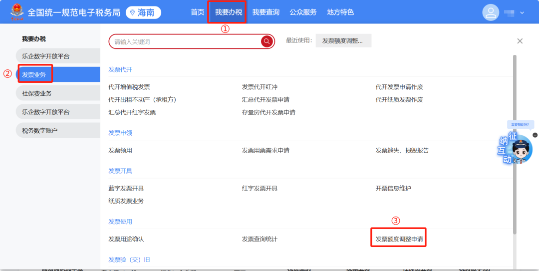 或者在全国统一规范电子税务局(新电子税局)首页热门服务,点击【发票业务】—【发票额度调整申请】,进入功能页面。