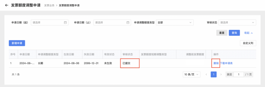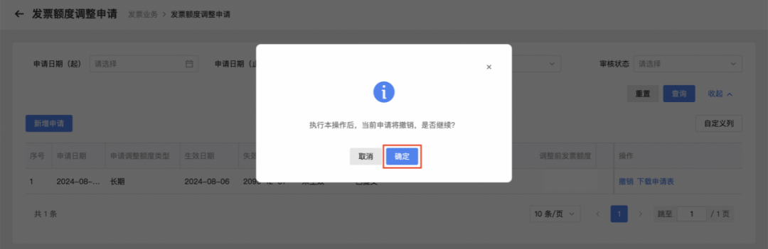 您可以在“发票额度调整申请”页面查看审核状态。若您存在误操作,且审核状态为“已提交”的,可以进行撤销操作,点击【撤销】—【确定】即可。
